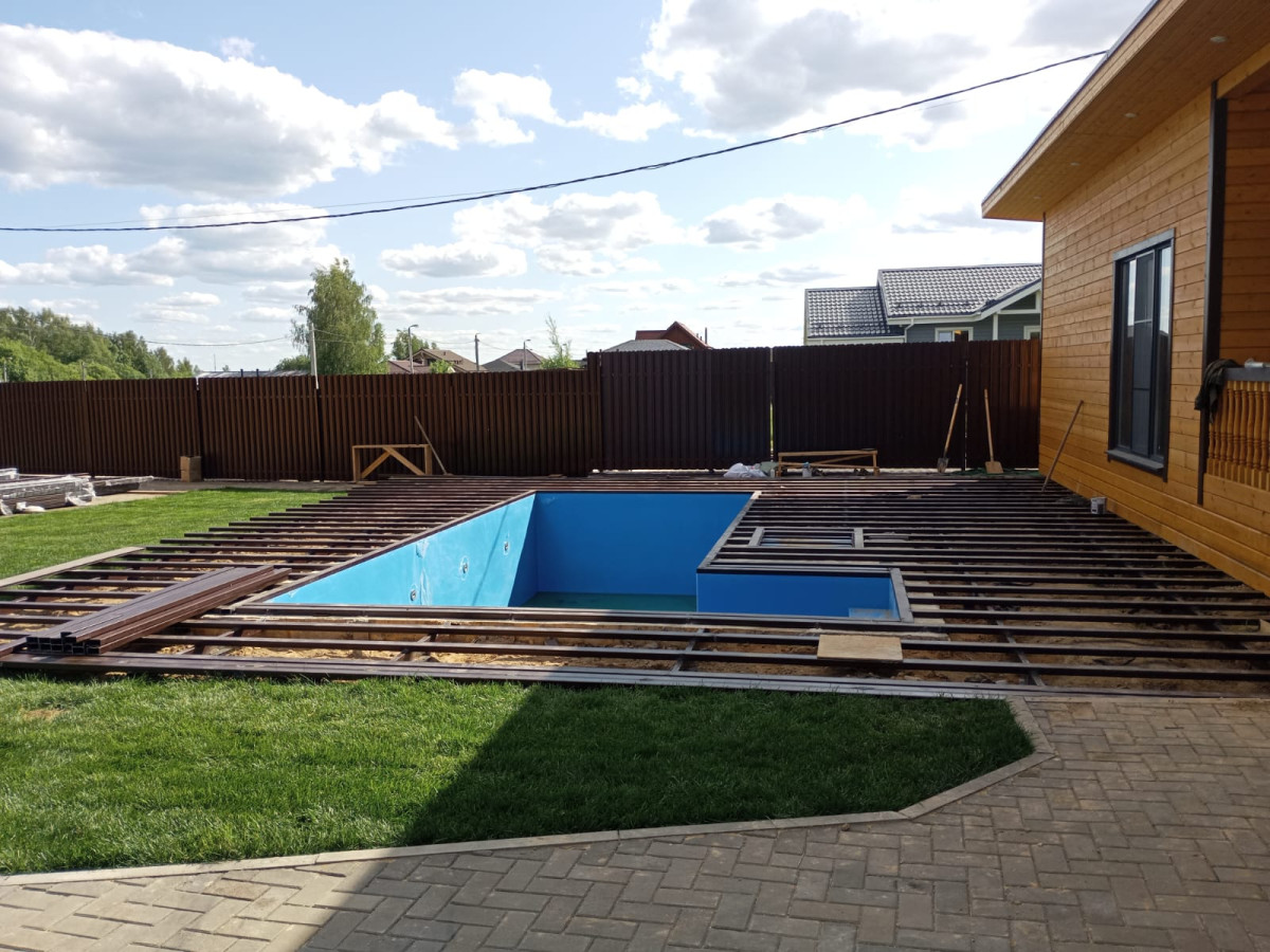 Смонтирован настил у бассейна (металлокаркас на сваях). Торцы зашиты доской. По периметру отделка ступенью шириной 165 мм.